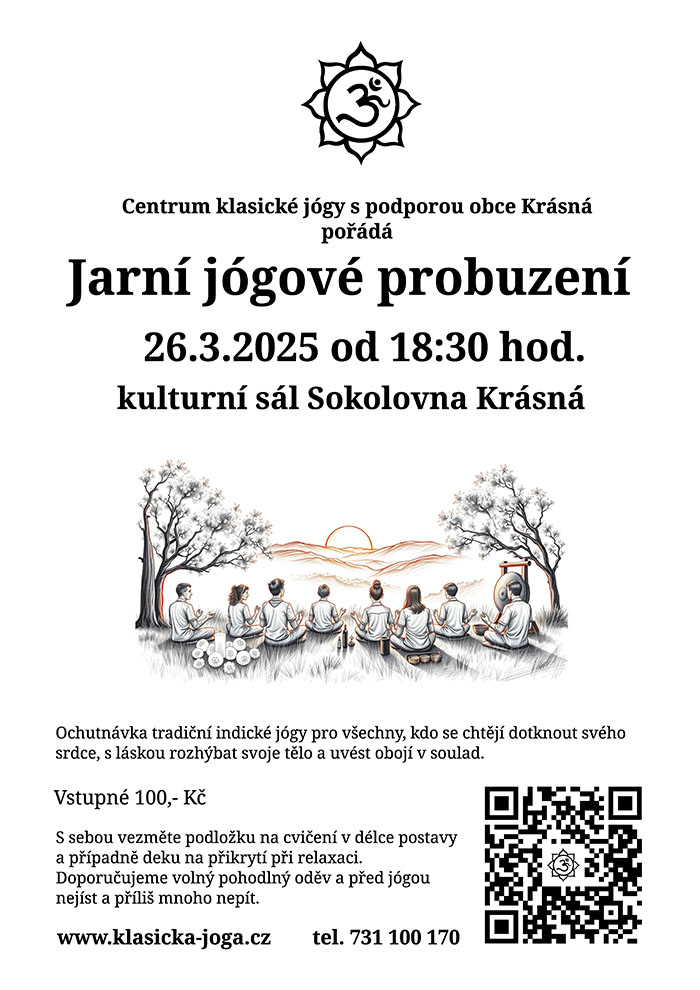 Centrum klasické jógy s podporou obce Krásná pořádá Jarní jógové probuzení 26.3.2025 od 18:30 hod., kulturní sál Sokolovna Krásná