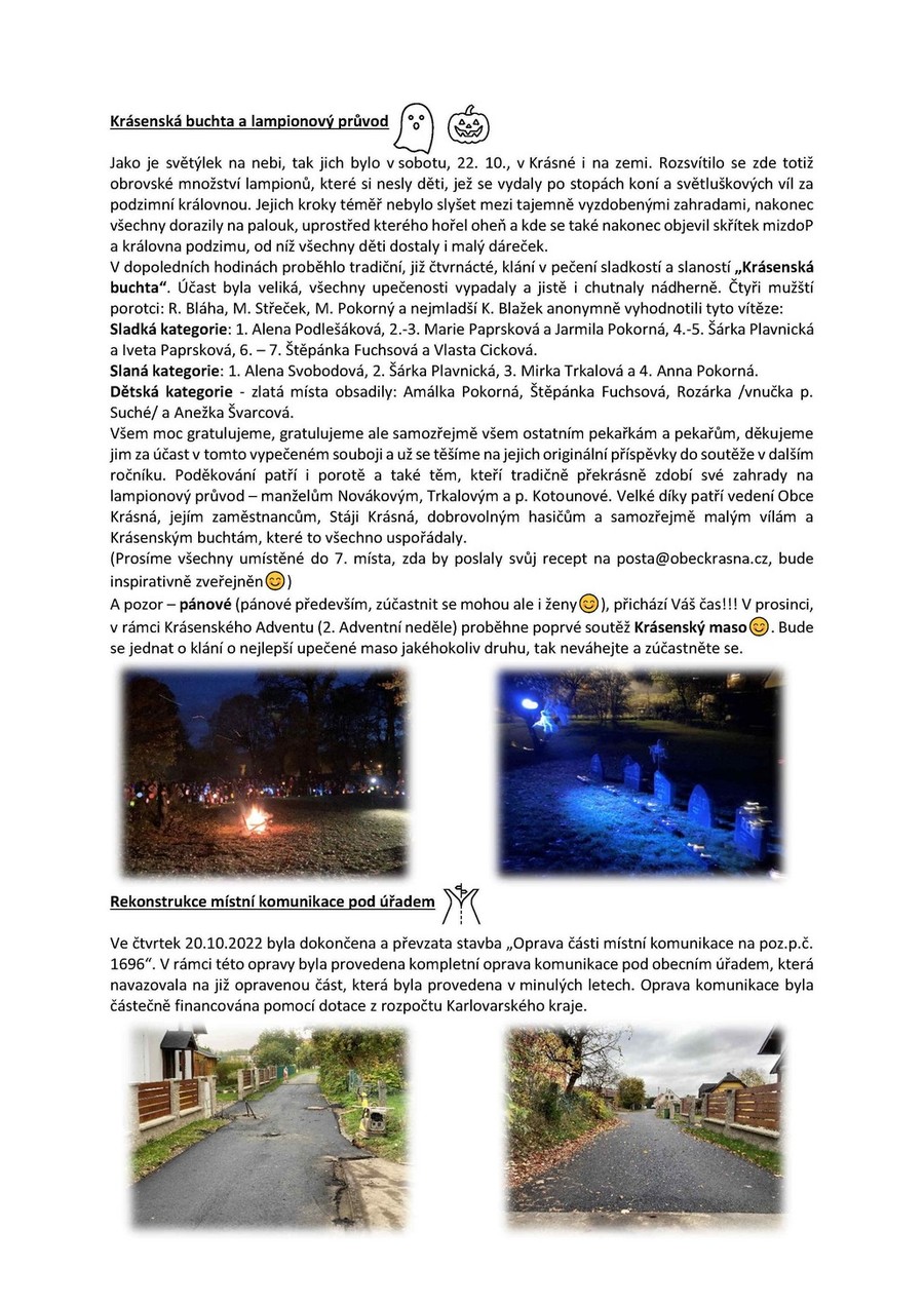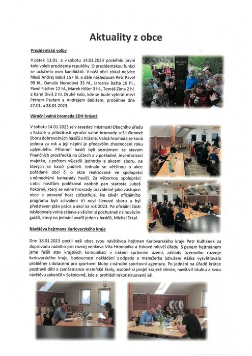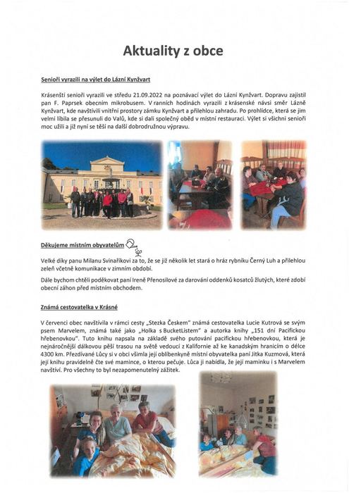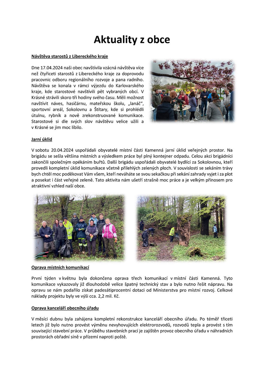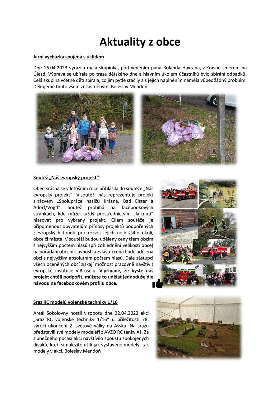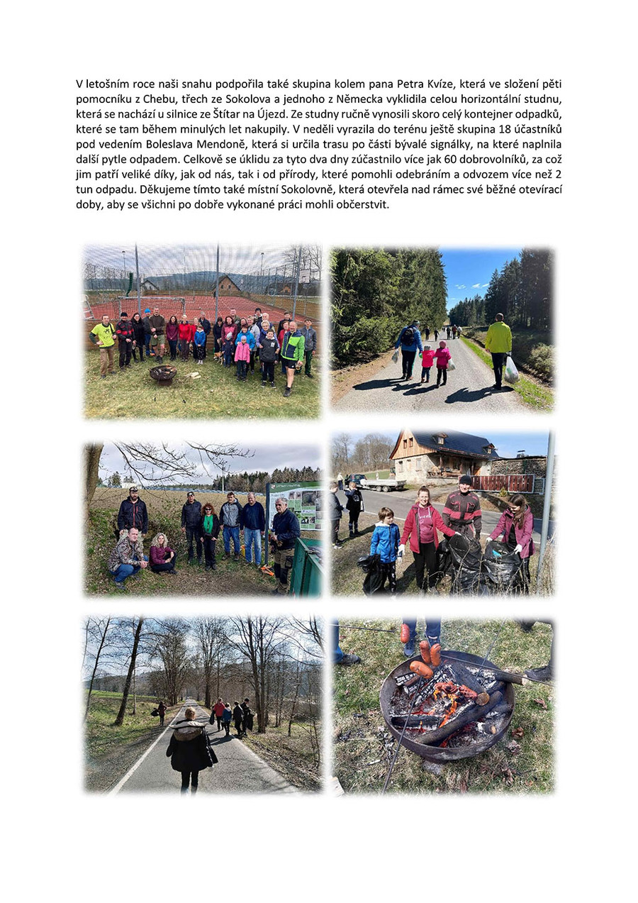 V sobotu dne 23. 4. 2022 se na Krásenské návsi sešlo, i přes velký počet omluvenek z důvodu nemoci, více než 30 dobrovolníků, kteří vyrazili na jarní úklid Krásné a širokého okolí. V rámci úklidové akce byl proveden úklid také v Újezdě, Štítarech a Kamenné osadě. Bylo sebráno skoro půl tuny odpadu a více jak 20 pneumatik. Již o den dříve se do úklidu zapojila naše mateřinka, která uklidila sportovní areál a veřejné pozemky přiléhající k mateřské škole. Dalšími brigádníky, kterým není naše příroda lhostejná jsou děti z Jezdeckého klubu Krásná, které si vzaly na starost les podél komunikace do Dolní Krásné. Celá akce byla ukončena v místní Sokolovně, kde mohli všichni doplnit energii připraveným jídlem a pitím. Děkujeme moc všem, kteří přišli pomoc a budeme věřit, že příští rok už nebudeme mít co uklízet.