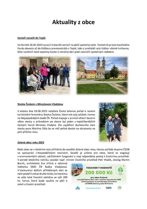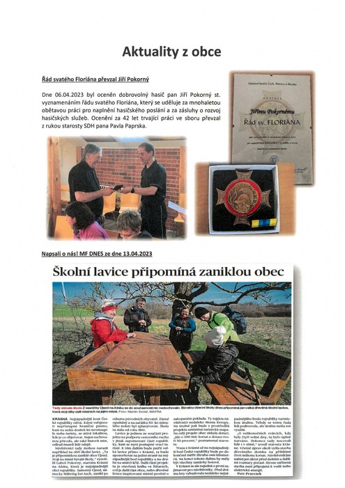 Ve středu 13.04.2022 místní ženy z klubu seniorů provedly vyčištění, úpravu a výsadbu květinové výzdoby do truhlíků v centrální části obce. Dále připravily také "trojúhelník" k následné výsadbě a provedly jarní střih stávajících keřů. Za zkrášlení veřejných prostor děkujeme paní Evě Novákové, Marii Paprskové, Marii Strnadové a Jarmile Pokorné.