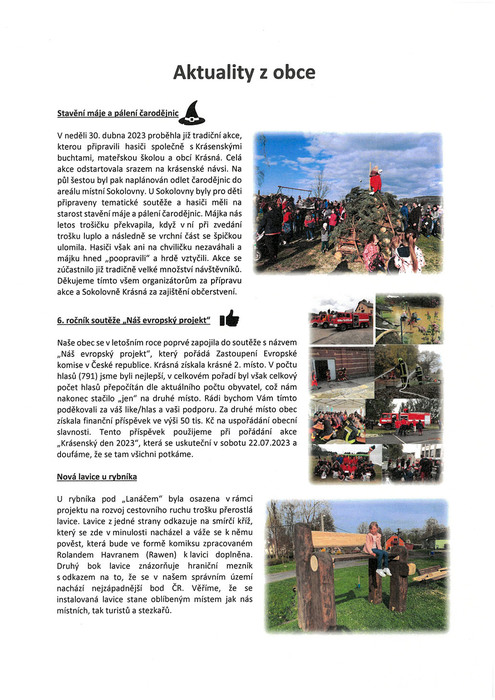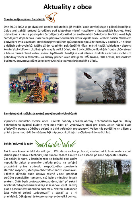 V sobotu 16.04.2022 proběhla brigáda na přípravu májky a dřeva na pálení čarodějnic, které se uskuteční dne 30.04.2022 v areálu Sokolovny Krásná. Na brigádu vyšlo slunečné počasí a dorazil velký počet dobrovolníků. Část brigádníků připravovala májku a dřevo na hranici a zbylá část odjela do Újezdu, kde se odtahalo a naložilo dřevo z polomů, které naprosto znepřístupnily cestu z Mostu Evropy na Nejzápadnější bod ČR. Nakonec jsme ještě postavili hranici a májku řádně připravili.